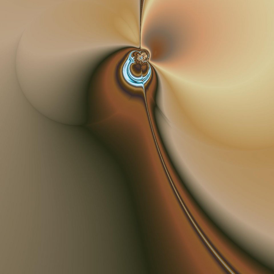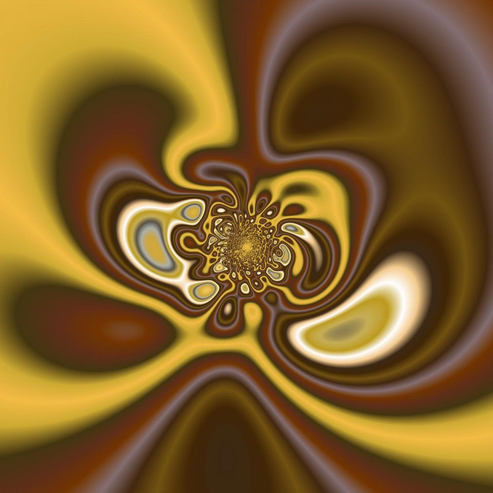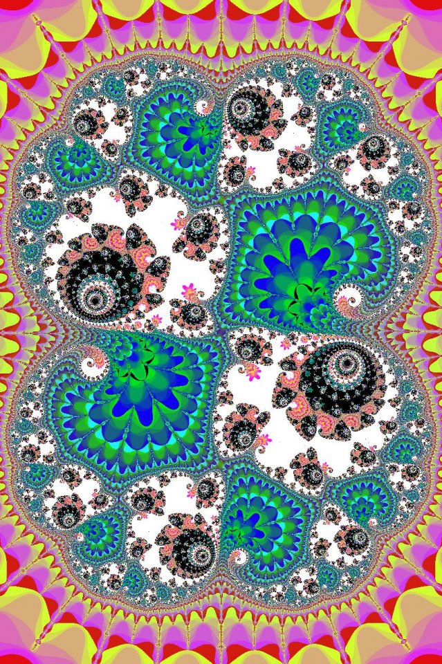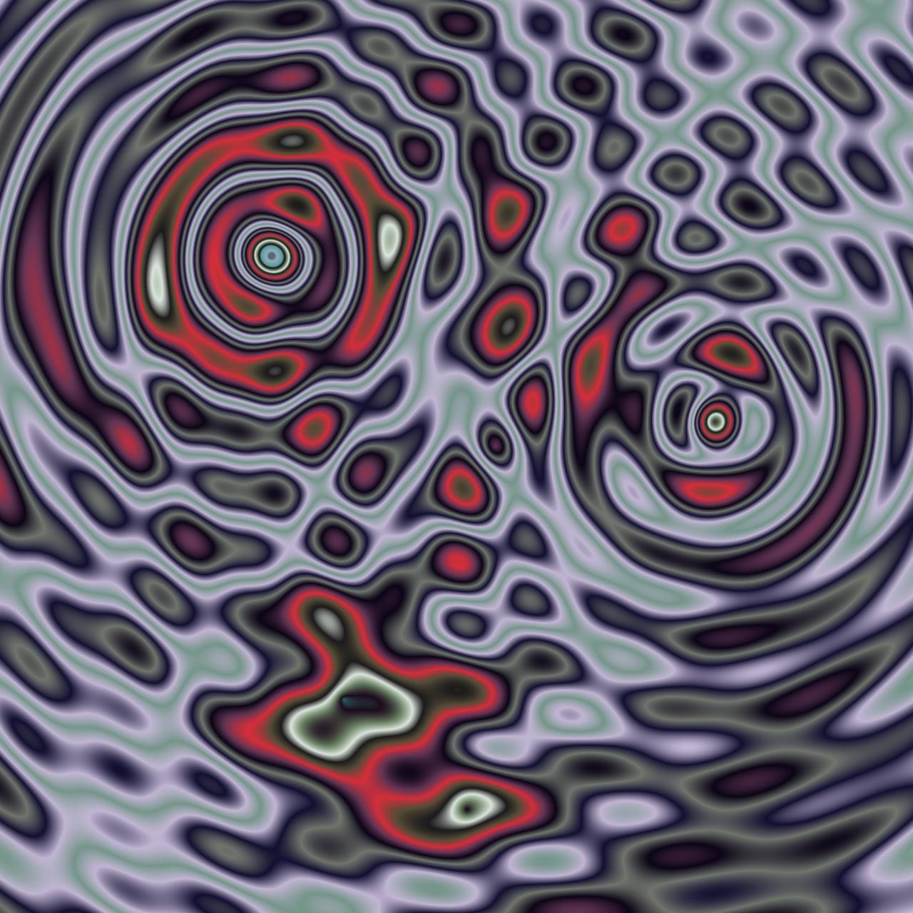Dem Bild liegt ein Modell von Wellen auf einer Wasseroberfläche zugrunde, wie sie miteinander kommunizieren, sich gegenseitig auslöschen oder verstärken. Eine mathematische Transformation kehrt dabei das Innere nach außen und sorgt für dieses phantastische Spiel der Formen.