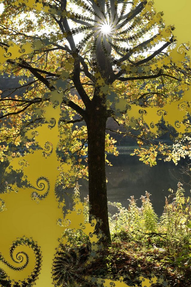 So entsteht ein Bild zwischen Wirklichkeit und Abstraktion. Die Landschaft bleibt erkennbar – der Baum, das Wasser, das Ufer –, doch gleichzeitig öffnet sich eine zweite Ebene. Die mathematischen Spiralen greifen die lebendigen Strukturen der Natur auf und verstärken sie. Licht wird zu Bewegung, Bewegung zu Muster.