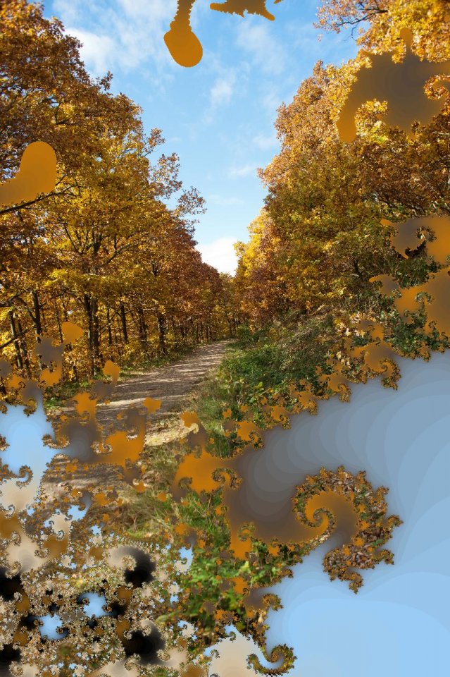 Über die fotografische Szene legen sich goldene Flächen und spiralförmige Muster. Sie erinnern an natürliche Wachstumsformen, an Schneckenhäuser, Wirbel oder die verborgenen Strukturen von Pflanzen. Diese Formen scheinen sich aus dem Licht selbst zu entwickeln: aus den Sonnenstrahlen, die zwischen den Ästen aufleuchten, aus den Bewegungen des Herbstes, der Blätter und Luft in sanfte Drehungen versetzt.