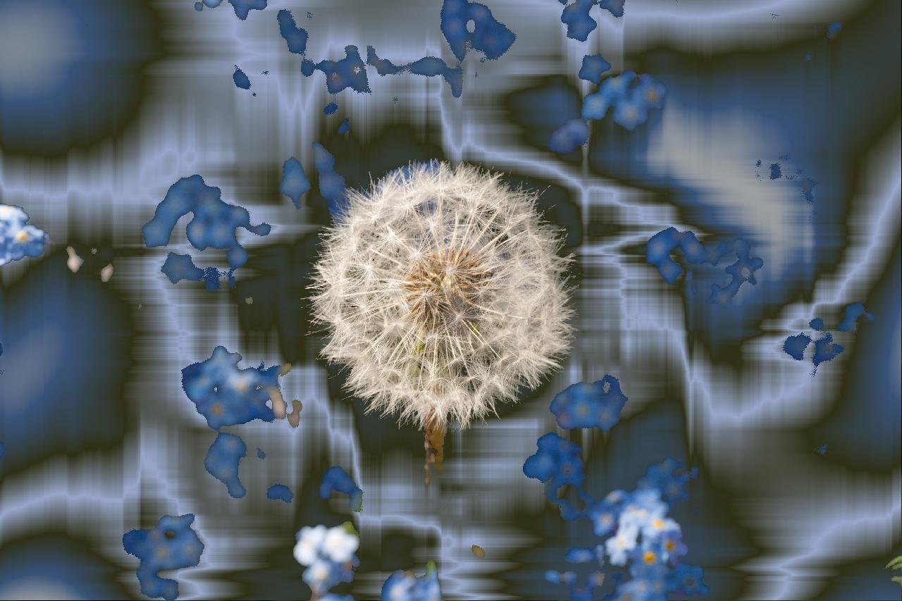 Löwenzahn und Vergissmeinnicht liefern die Grundlage für diese Arbeit. Der weiße Fruchtkörper schwebt schwerelos im Farbenmeer aus blauen Blüten.