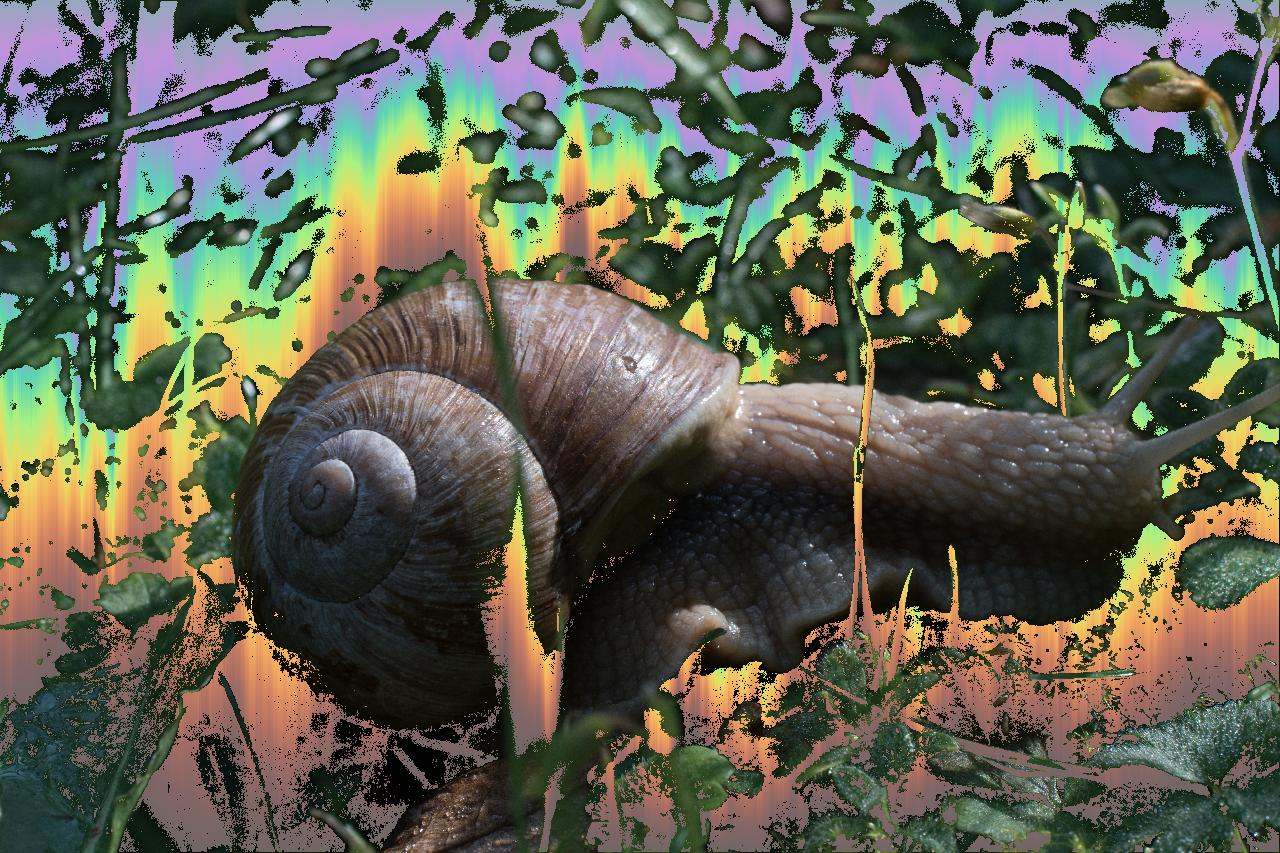 Die Fotografie einer Weinbergschnecke vom August 2022 liefert die Schablone für den Regenbogen, der das Tier aus seiner natürlichen Umgebung hervorhebt.
