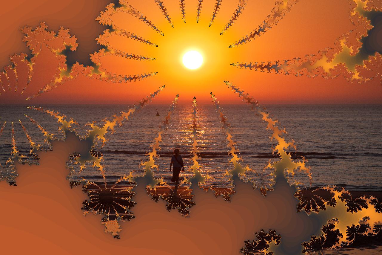 „Abendstimmung“ vereint Fotografie und digitale Transformation zu einer Komposition voller Wärme und Sehnsucht. Die untergehende Sonne über dem Meer strahlt in intensiven Farben, die sich in fraktalen Strahlen über den Himmel ergießen. Eine einzelne Figur am Strand wirkt wie ein stiller Beobachter dieser erhabenen Szenerie. Das Werk verwandelt die reale Küstenlandschaft in einen imaginären Ort, der zwischen Traum und Wirklichkeit schwebt.
