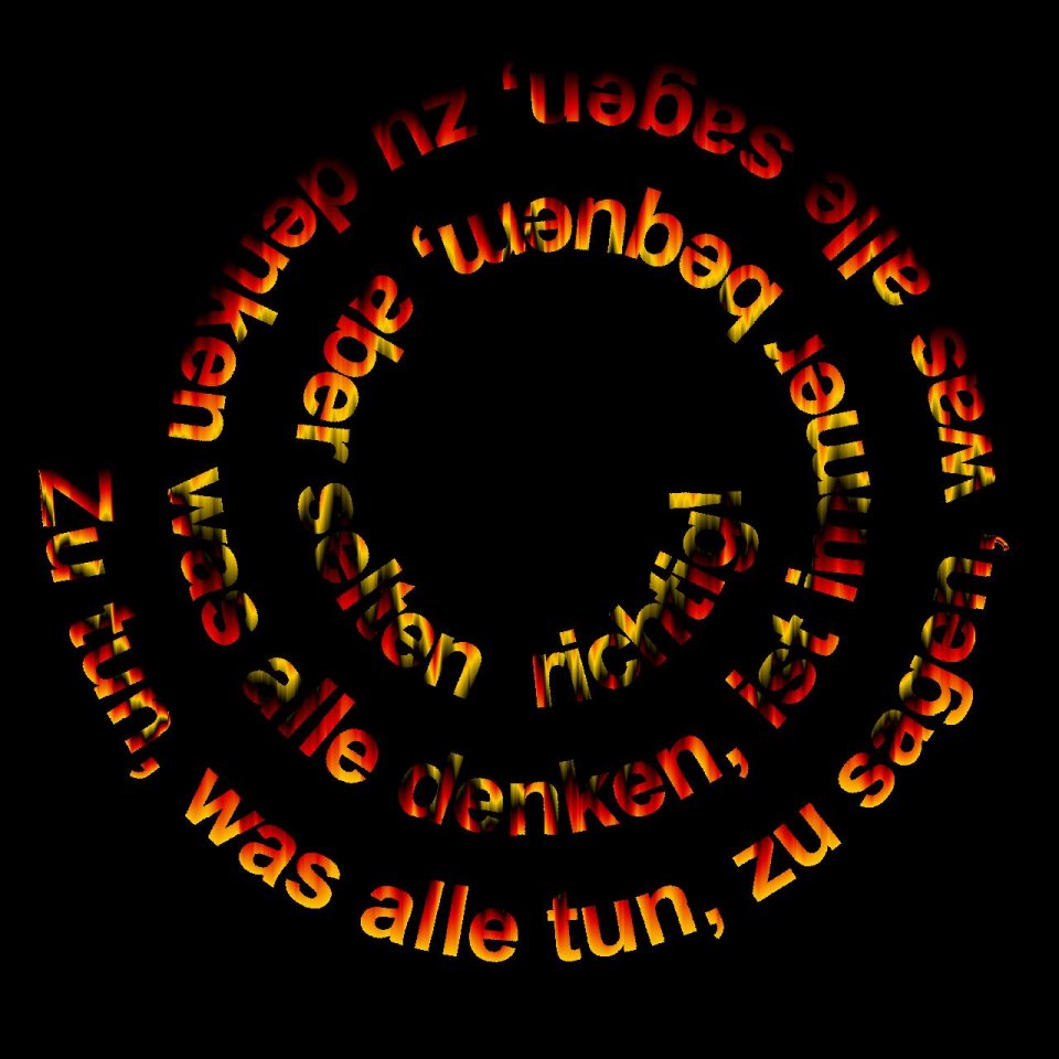 Der Fantasie sind keine Grenzen gesetzt bei dieser Grafik in grellen Farben. Grundlage der Formen sind kreisförmige Wellen, wie sie auf der spiegelglatten Oberfläche eines Sees zu beobachten sind, wenn man Steine hineinwirft. Die besondere Perspektive führt zu diesem phantastischen Spiel von Formen und Wahrnehmungen.