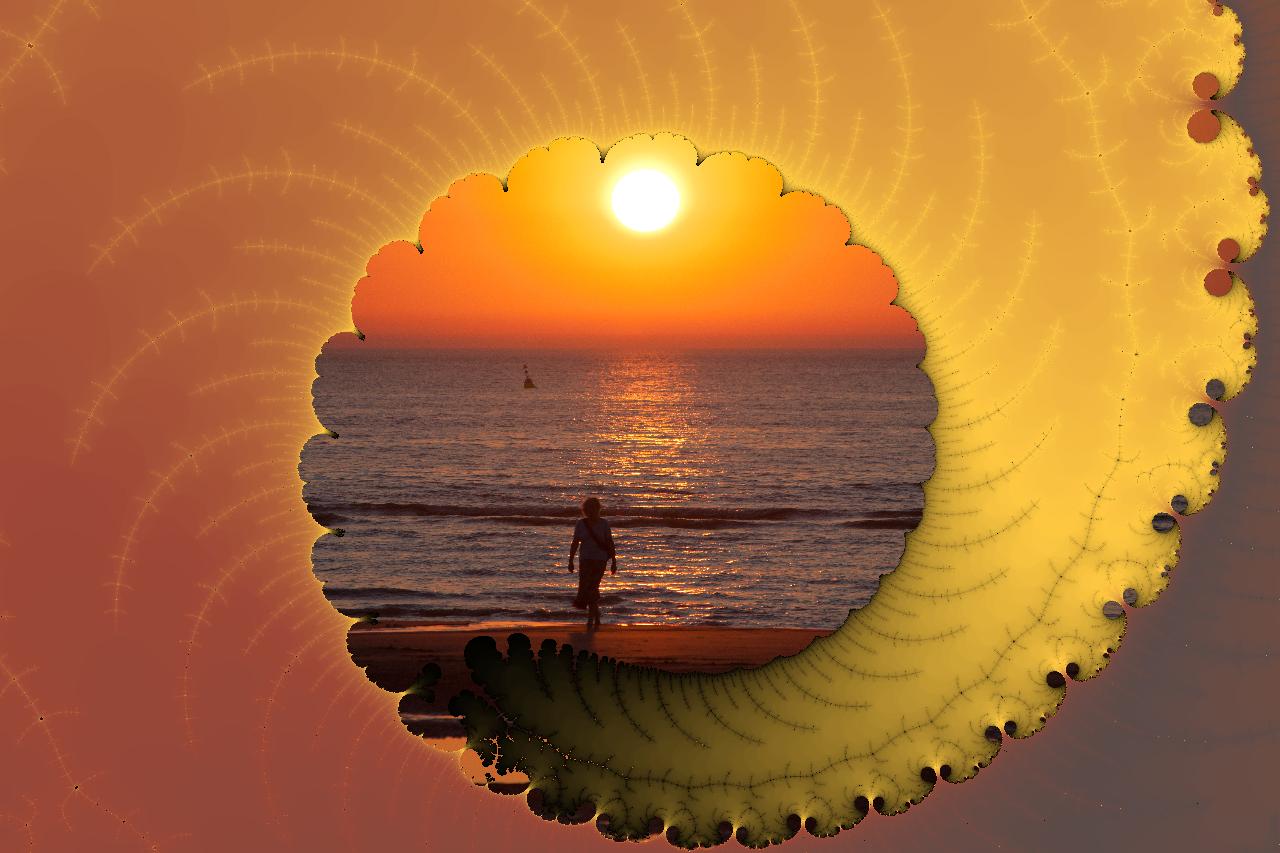 Am Nordseestrand entstand diese Bild im Juli 2012. Die Sonne brandet als Fraktal in den Farben der Fotografie rund um die abendliche Stimmung und rahmt die romantische Szenerie vor ihrem Gang hinter den Horizont.