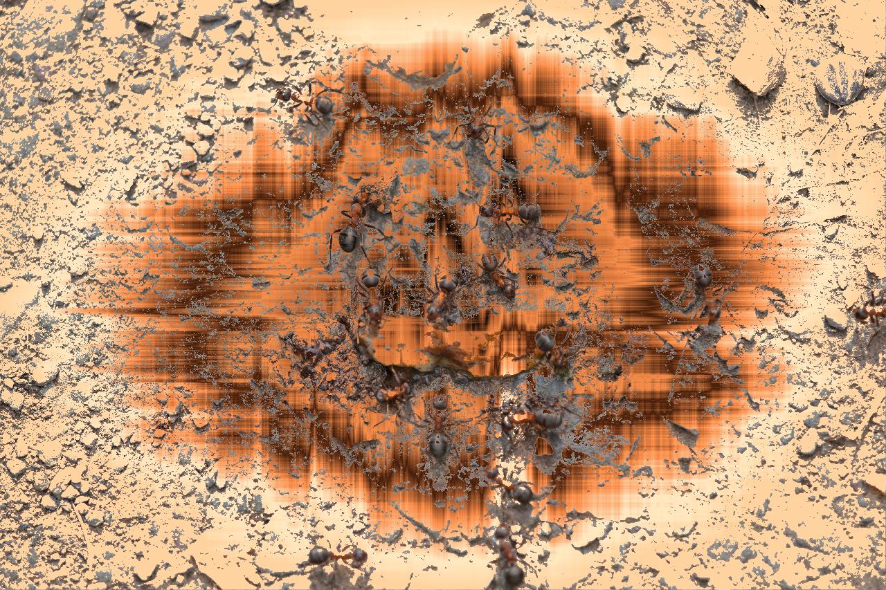 Meine Enkelin meinte spontan, das sei doch das Bild einer Katze. Bei näherer Betrachtung formen Ameisen auf einem Waldweg bei Nideggen die Teile der in die Fotografie vom April 2014 eingewobenen Form.