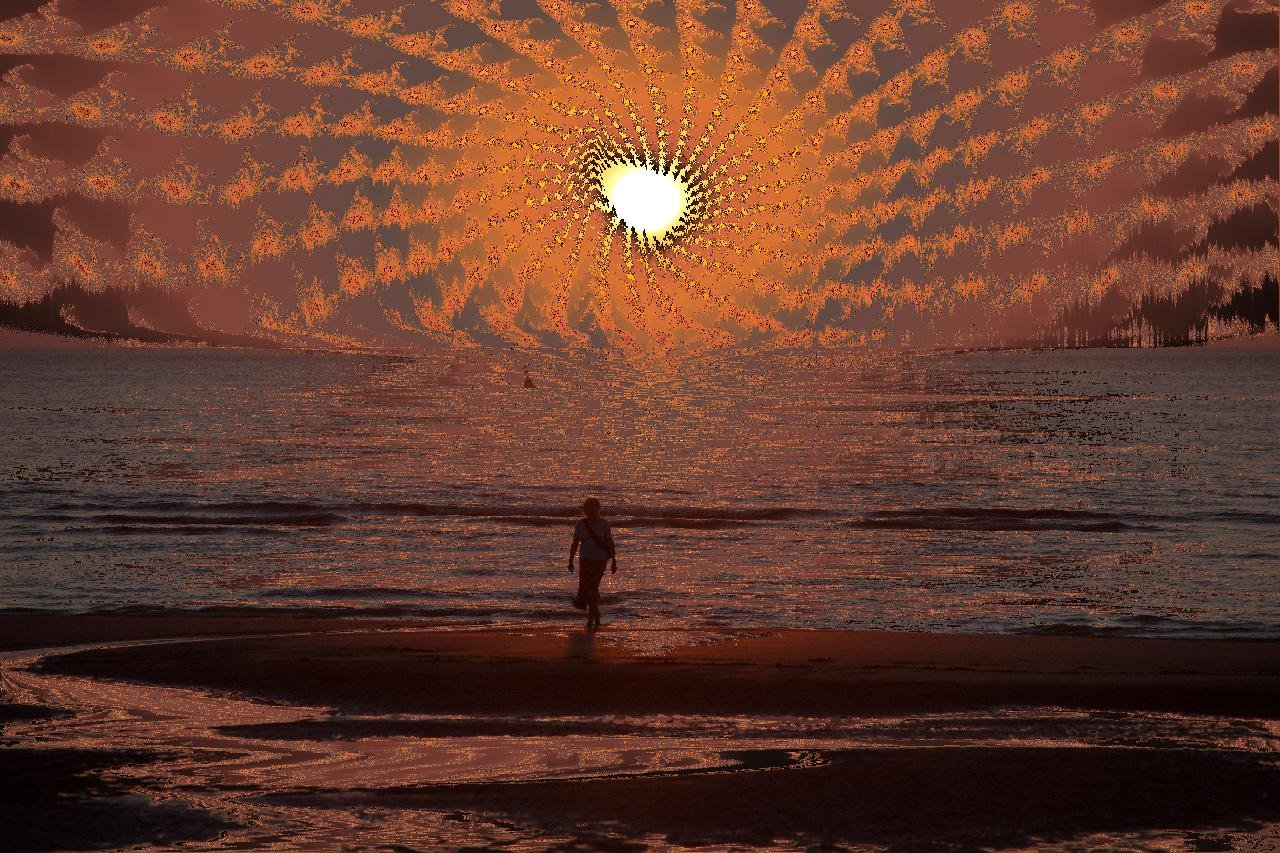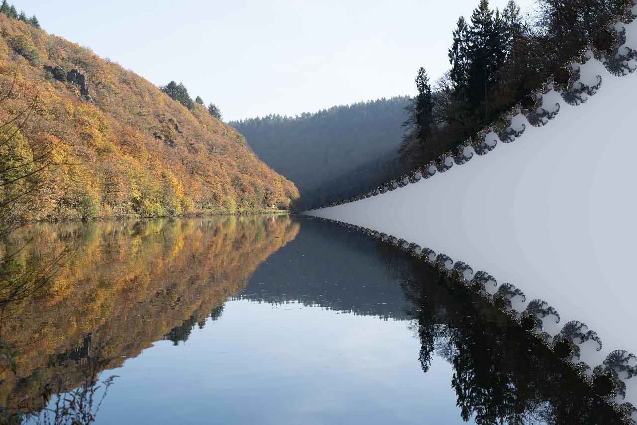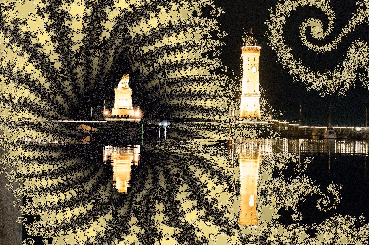 In „Tor zur Unendlichkeit“ begegnen sich Natur, Architektur und Mathematik in einer nächtlichen Komposition von faszinierender Tiefe. Die Aufnahme des Lindauer Hafens mit seinem markanten Löwen und dem Leuchtturm wird durch fraktale Strukturen überlagert, die sich wie unsichtbare Wellen der Ordnung über die Szene legen. Aus der Dunkelheit entsteht ein vibrierendes Geflecht aus Licht, Reflexion und Symmetrie – die Grenzen zwischen Fotografie und Berechnung verschwimmen.