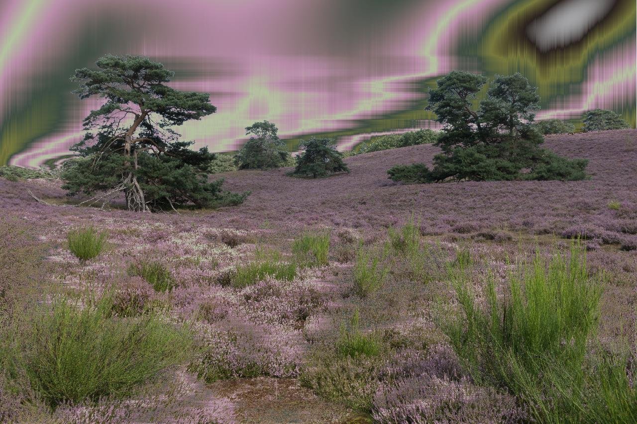 Das Bild entstand auf Grundlage einer Fotografie mit dem Titel "Brunsumer Heide", aufgenommen im August 2019. Die Grafik verwendet die Farben der Fotografie.