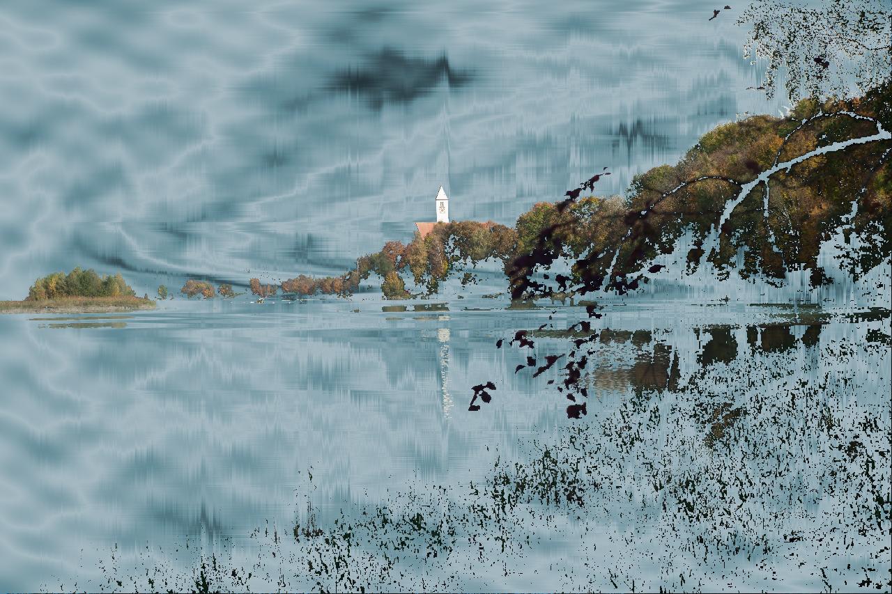 Hinter dem Obersee bei Berchtesgaden endet die Welt in steilen Hängen und Wasserfällen, die sich in seiner unbewegten Oberfläche spiegeln. Im Oktober 2008 entstand die Aufnahme hinter der Grafik. Die Farben entstammen der Fotografie. Die blattartigen Strukturen wurzeln an der Grenze zwischen realer Landschaft und Spiegelbild.