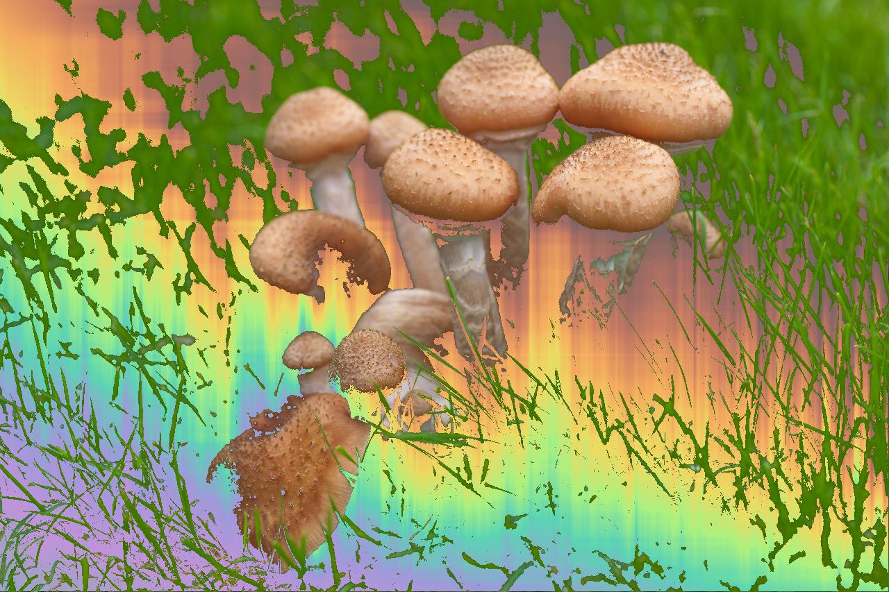 Hinter dem Obersee bei Berchtesgaden endet die Welt in steilen Hängen und Wasserfällen, die sich in seiner unbewegten Oberfläche spiegeln. Im Oktober 2008 entstand die Aufnahme hinter der Grafik. Die Farben entstammen der Fotografie. Die blattartigen Strukturen wurzeln an der Grenze zwischen realer Landschaft und Spiegelbild.