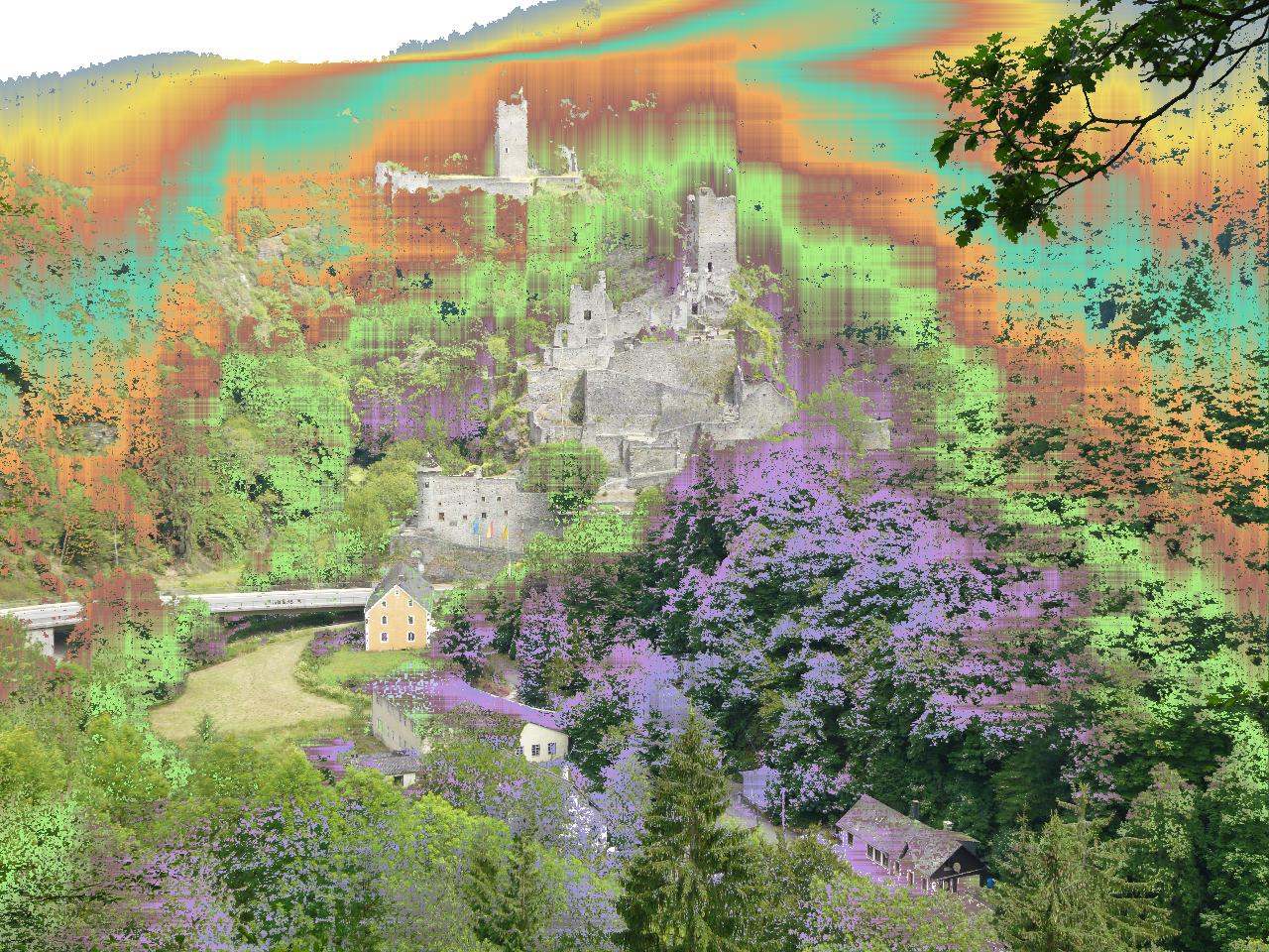 Das Bild entstand auf Grundlage einer Fotografie mit dem Titel "Nideggen-Obermaubach", aufgenommen im Mai 2018, bei den GPS-Koordinaten 50 deg 42’ 49.38" N, 6 deg 29’ 22.00" E. Die Grafik verwendet die Farben der Fotografie.