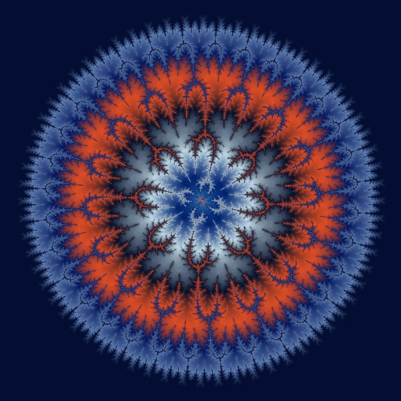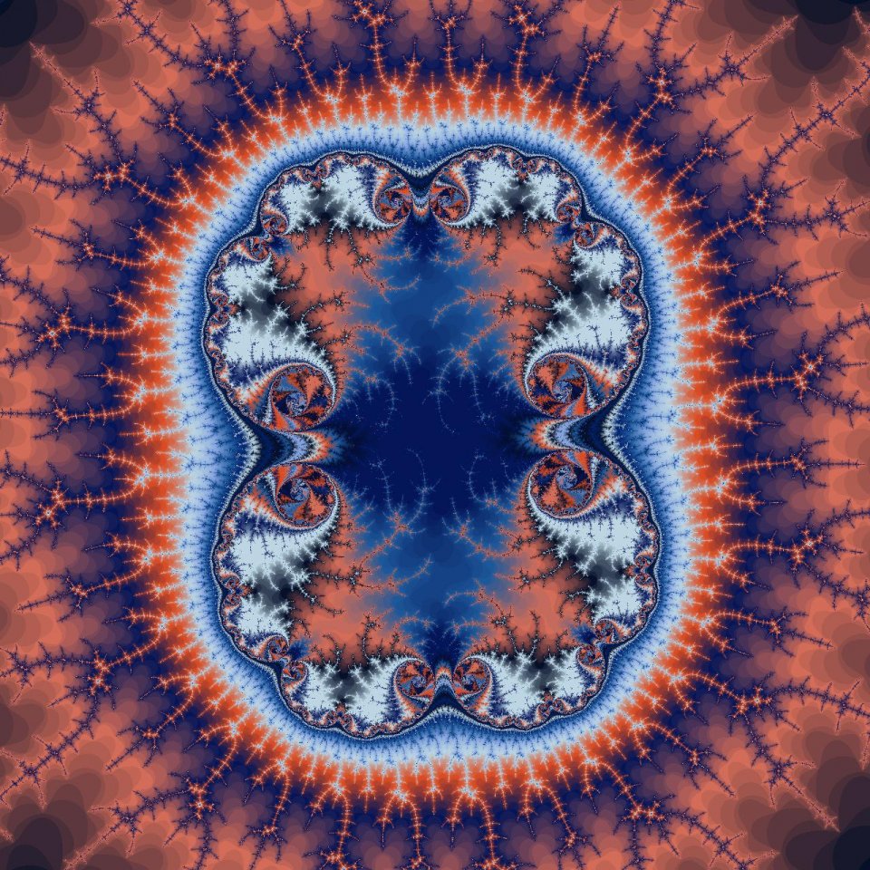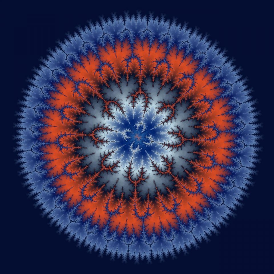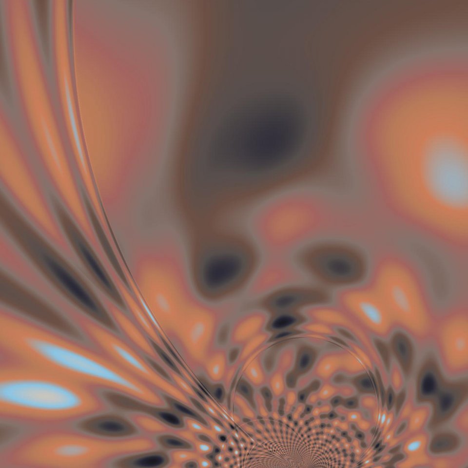 Das Besondere an dieser Komposition ist die harmonische Übertragung der Farben eines Dompfaffs auf die fraktalen Schichten. Das tiefe, kühle Blau im Zentrum erinnert an das klare Wasser einer verborgenen Lagune, während die äußeren, fein verästelten Strukturen in den charakteristischen Lachs- und Grautönen des Vogels pulsieren. Die dornenartigen Ausläufer, die in den Umraum greifen, wirken wie filigrane Korallen oder Nervenbahnen. Durch diese Farbwahl verliert das Fraktal seine künstliche Distanz und gewinnt eine fast haptische, lebendige Qualität. „Lagune“ ist somit eine ästhetische Brücke: Es zeigt, dass die Sprache der Mathematik und die Schönheit der Natur letztlich demselben Ursprun