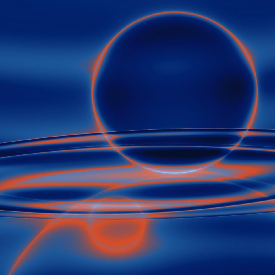 Unterhalb zieht sich eine horizontale Ebene durch das Bild, glatt wie Glas. Sie reflektiert die Kugel in verzerrter, wellenartiger Form. Das Rot bricht sich in geschwungenen Linien, die wie Energiebahnen durch die Fläche laufen. So entsteht der Eindruck einer Welt unter der Welt – eine Schattenversion, die nicht bloß spiegelt, sondern eigenständig pulsiert.